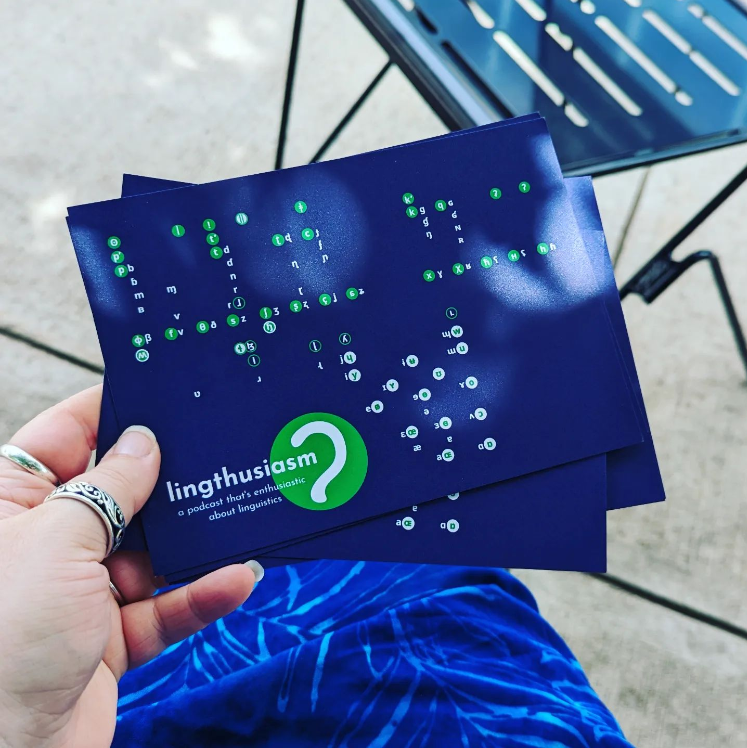 Left hand with rings holding blue cards with Lingthusiasm logo and green and white International Phonetic Alphabet.